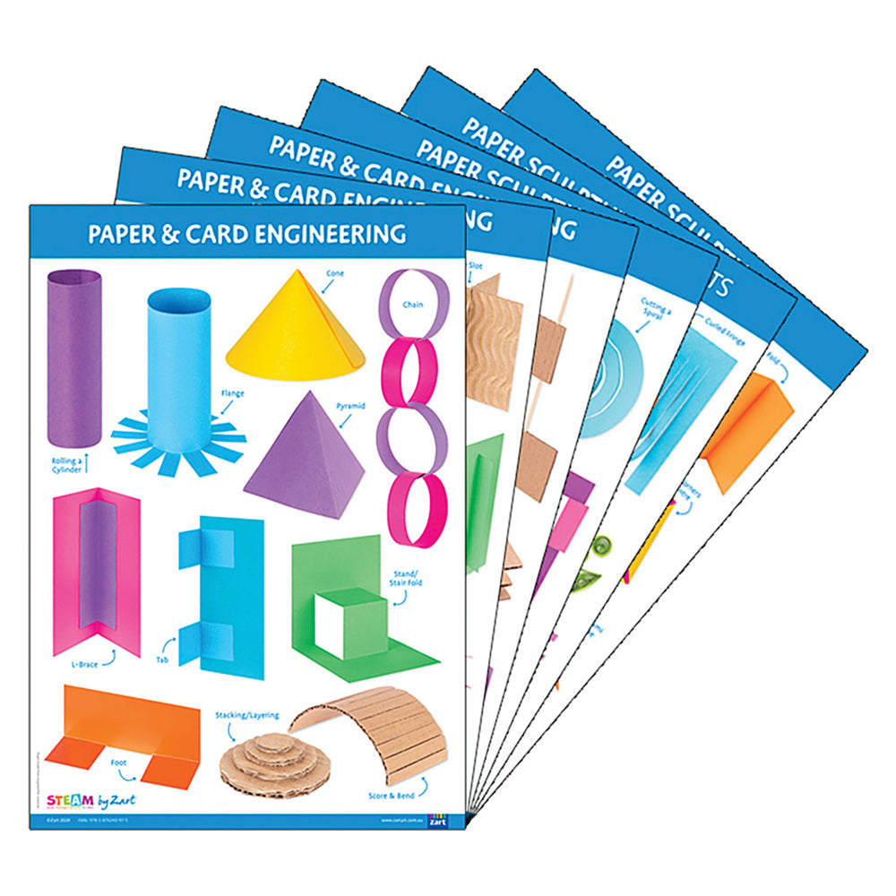 • Contents: Includes six charts covering different skills and techniques related to paper and cardboard, specifically in the areas of sculpture, construction, and engineering.